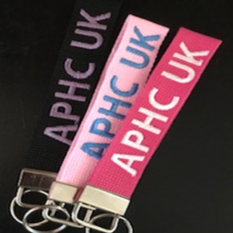 Wristlet made of cotton webbing wih machine embroidered “APHC UK” or “I LOVE MY APPY”